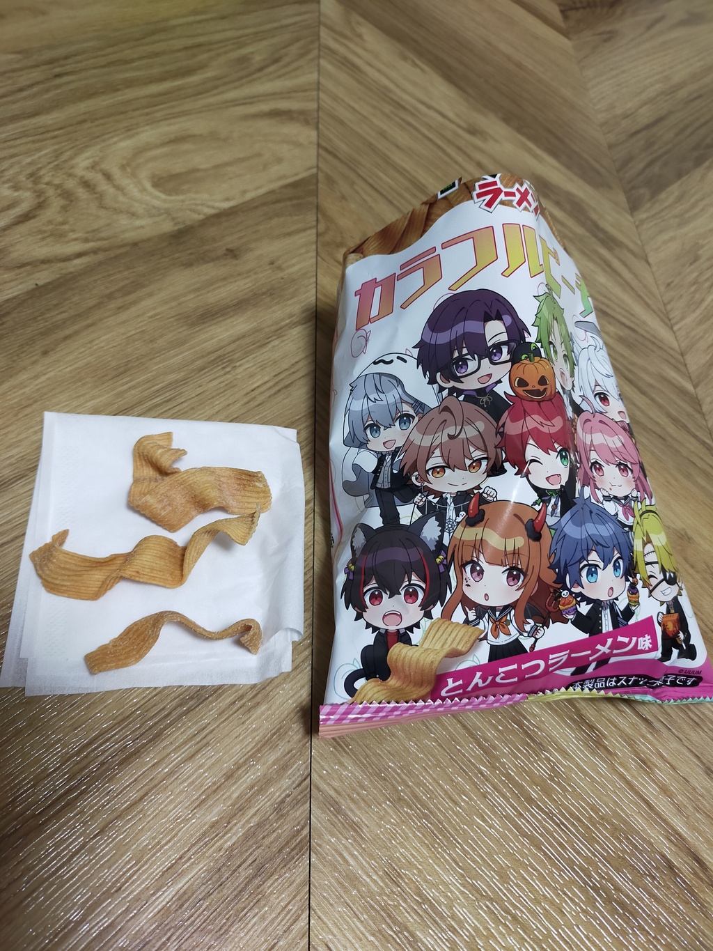 小麦粉(国内製造)、植物油脂、とんこつ風味パウダー、食塩、ポークエキスパウダー、粉末油脂、砂糖、ポークエキス、ミート調味エキス、オニオンパウダー、ガーリックパウダー、たんぱく加水分解物、ミート調味パウダー、野菜エキス、野菜エキスパウダー/加工デンプン、調味料(アミノ酸等)、香料、微結晶セルロース、乳化剤、酸化防止剤(ビタミンE)、酸味料、甘味料(ステビア、カンゾウ)、ビタミンB1、香辛料抽出物、(一部に小麦・ごま・大豆・鶏肉・豚肉・ゼラチンを含む)