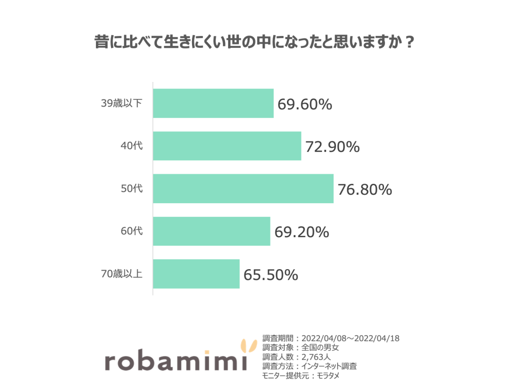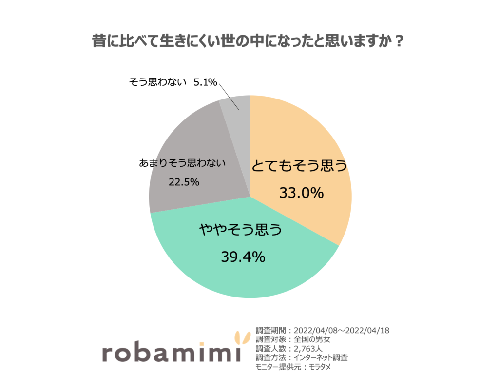 なんと約4人に3人近くの人が、「とてもそう思う」「ややそう思う」と回答し、「昔に比べて生きにくい世の中になった」と感じていることが判明しました。