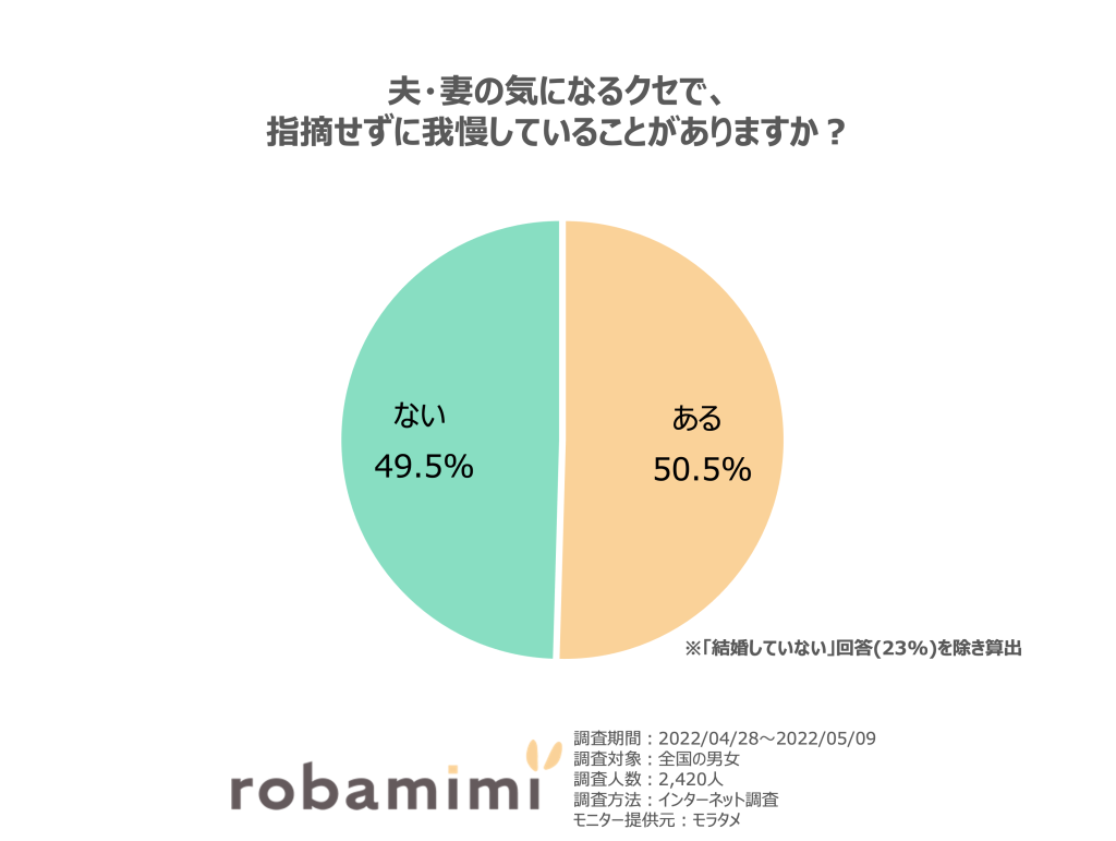 指摘せずに我慢している夫・妻のクセが「ある」と回答したのは全体の50.5%と、約半数となりました。2人に1人は、何かしら思いつつも心のうちにとどめているようです。なお男女別に見ると、「ある」と回答した割合は男性で51.8%、女性で50.0%と、男女差はほとんどなく、夫、妻どちらも同じくらい相手に対して我慢しているところがあることが判明しました。