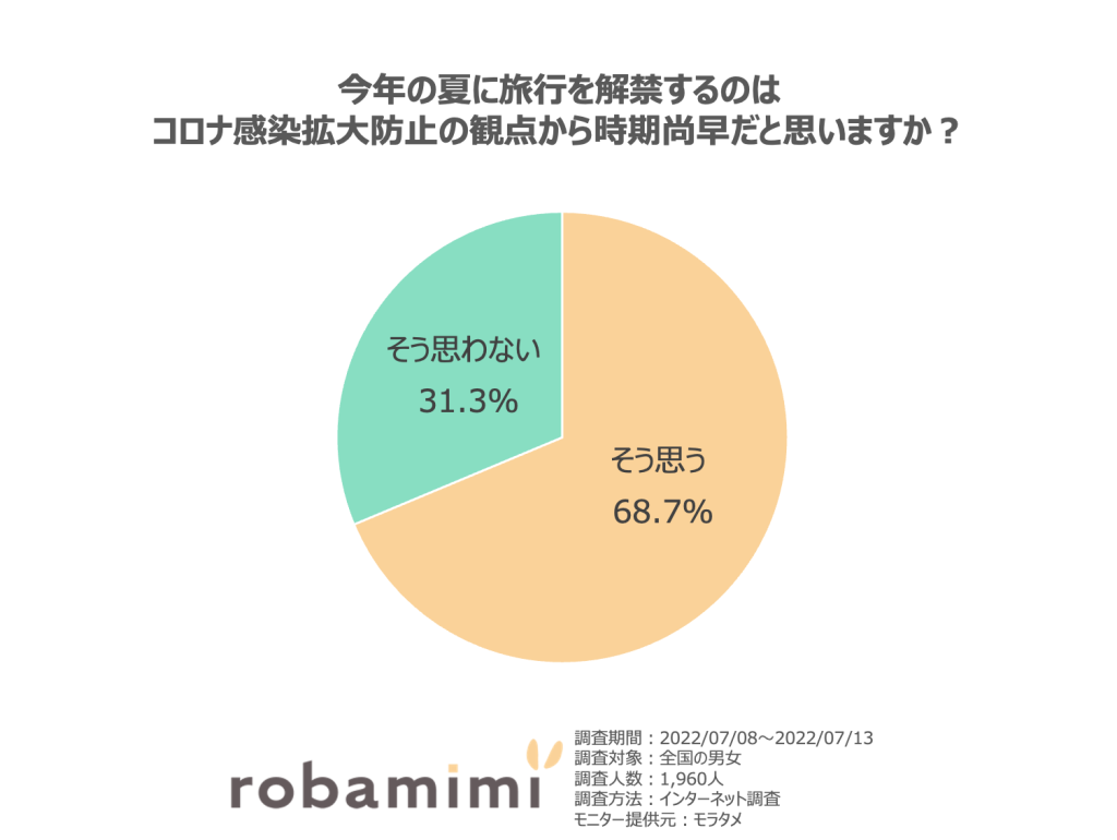 \ロバ耳アンケート/ 今年の夏に旅行を解禁するのは、コロナ感染拡大防止の観点から時期尚早だと思いますか?あなたはどう思いますか?!? 世間で話題になっているコトや 人に聞けない実は気になる話題を モラタメの新メディア「ロバ耳」が大調査! 新型コロナ第7波の渦中、約7割の人が・・・