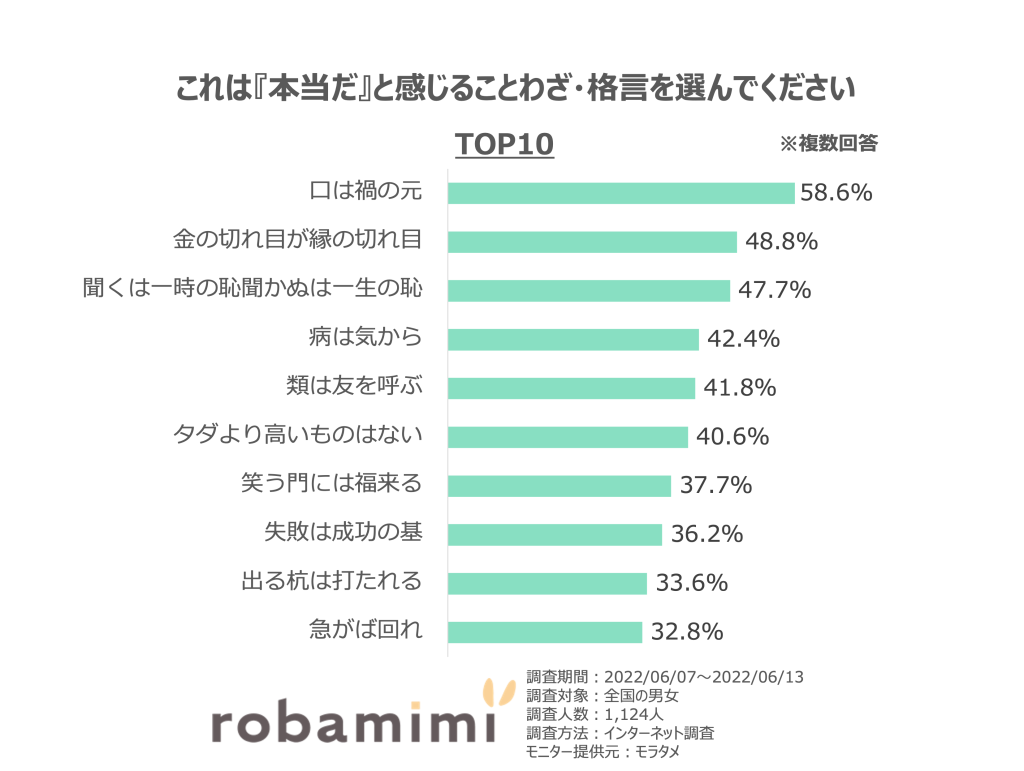 ことわざは古くからの言い伝えなだけあって、人間の真意をついているものが多いのではないでしょうか。時代が変わっても、人間の根本は変わらない…ということがよくわかる結果となりましたね。1位の「口は禍の元」のコメントでもあったように、現代だからこそ迂闊な行動には注意するべき場面もたくさんあります。ことわざはいつの時代も先人の知恵の宝庫ですね。