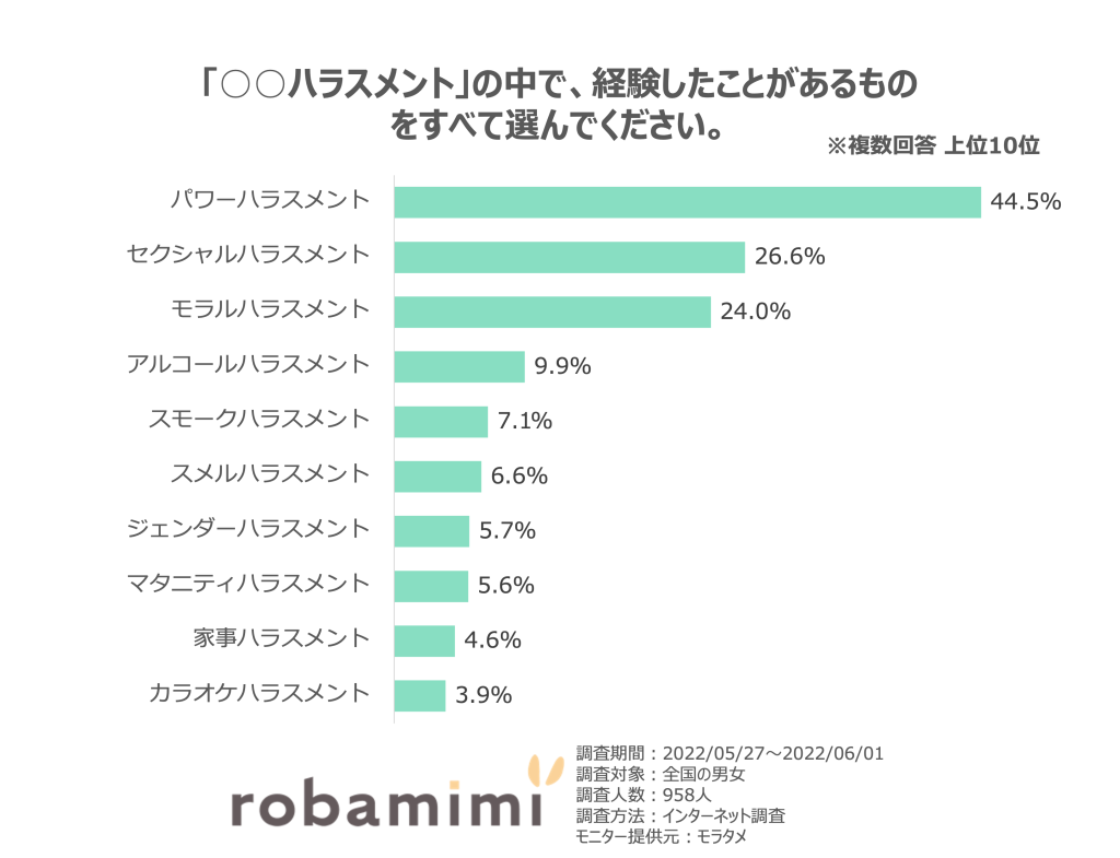 「○○ハラスメント」37種の中で、経験したことがあるものをすべて選んでください。