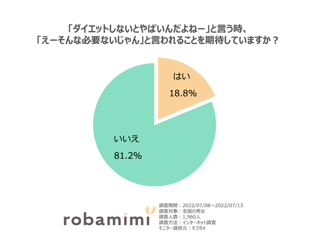 今回の調査で、約8割の人が「ダイエットしないとやばいんだよねー」という発言に対して「そんな必要ないじゃん」と言われることを期待していない、ということがわかりましたね。そう思っていても思っていなくても「そんな必要ないじゃん」と言ってしまいがちですが、実はその返答は正解ではないということが判明しました。さすがに「そうだよねー」とは言えないにしても、「一緒に頑張ろうね」「この方法がおすすめ」といったような同調が正解なのではないでしょうか。