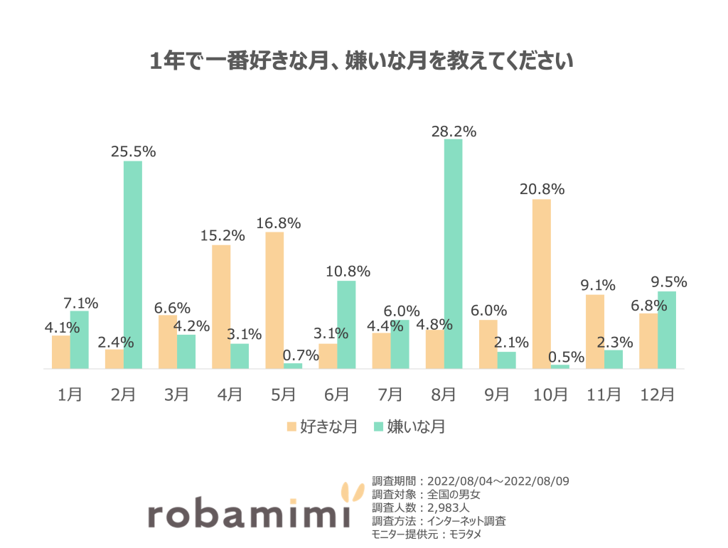 一方で嫌いな月は、約3割近くを占めた8月が第1位、約4分の1近くを占めた2月が第2位、続いて6月が第3位という結果に。