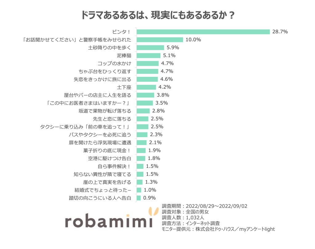 2位に選ばれた「『お話聞かせてください』と警察手帳をみせられた」は、恋愛ドラマだけでなく、刑事ドラマ、サスペンスドラマなどさまざまなジャンルのドラマで見受けられるシーンですが、それ以外の「ビンタ」「雨の中傘もささず号泣」「泥棒猫」「コップ水かけ」は、リアルでも主に恋愛シーンで起こることが多い傾向にありました。
