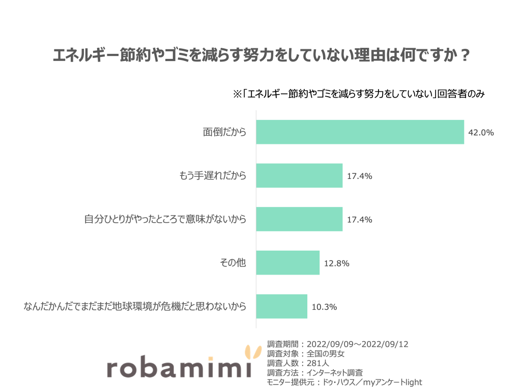「努力をしていない」と回答した人があげる努力しない理由としては、「面倒だから」がもっとも多い42.0%、次いで「自分ひとりがやったところで意味がないから」が 17.4%を占めました。