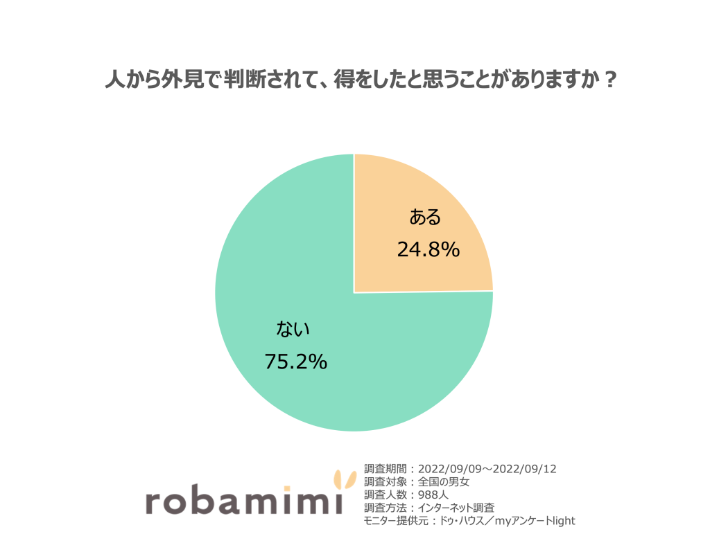約4人にひとりの割合で、外見で判断されて得をしたと思う人がいる、ということになります。