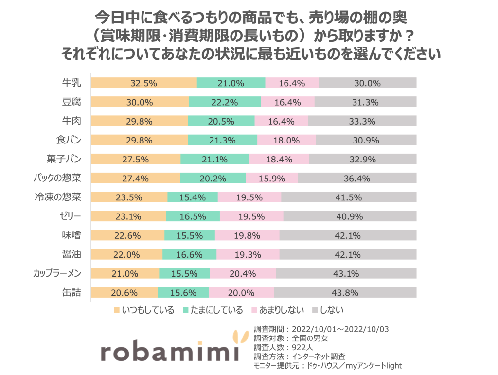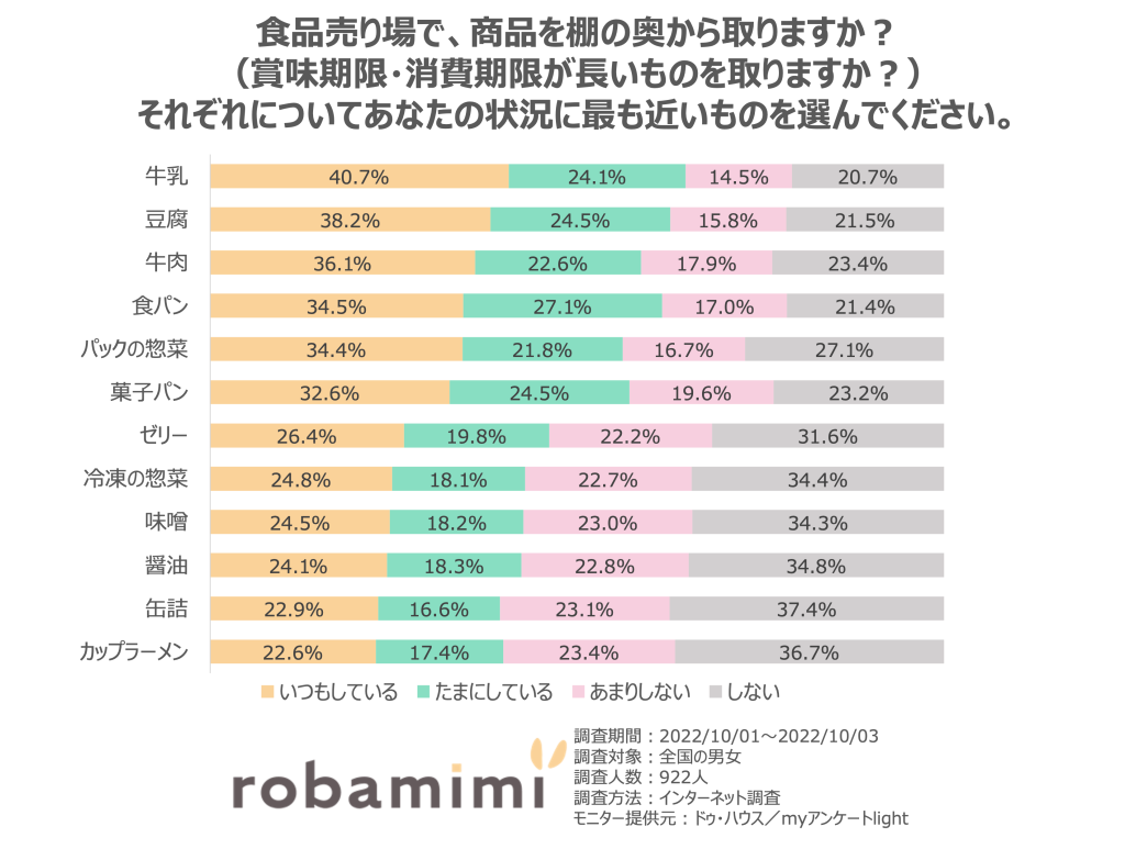 食品ごとに比較してみると、今日中に食べるつもりでも牛乳や豆腐、牛肉、パックの惣菜は約3割近くの人が奥からとるという結果になりました。