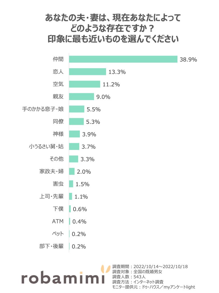 今回の調査では、「仲間」「恋人」「空気」といったいい夫婦の日にふさわしい回答が上位にランクインする結果になりました。