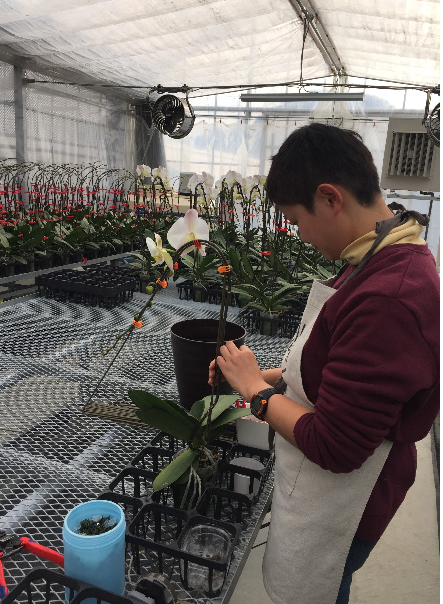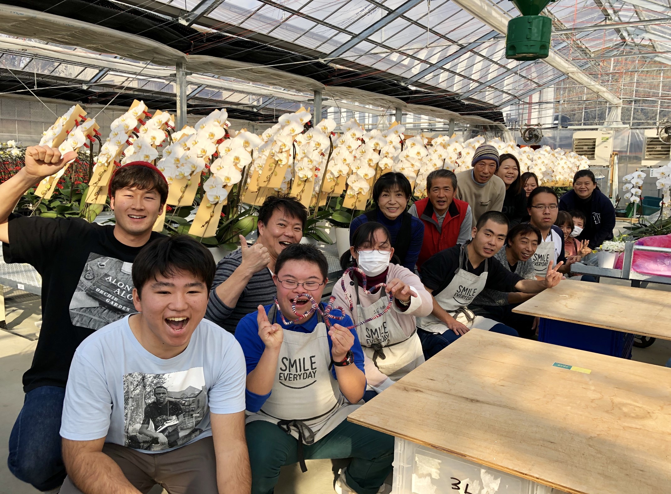 千葉県富津市のAlonAlonオーキッドガーデンでは、現在20名ほどの障がい者が胡蝶蘭栽培に取り組んでいます。水やり、茎の形を整えるための「仮曲げ」、生育状態にあわせた鉢の向き調整、苗の仕立て…、作業を細分化し、各人のできる範囲に応じて様々な仕事を分担しています。